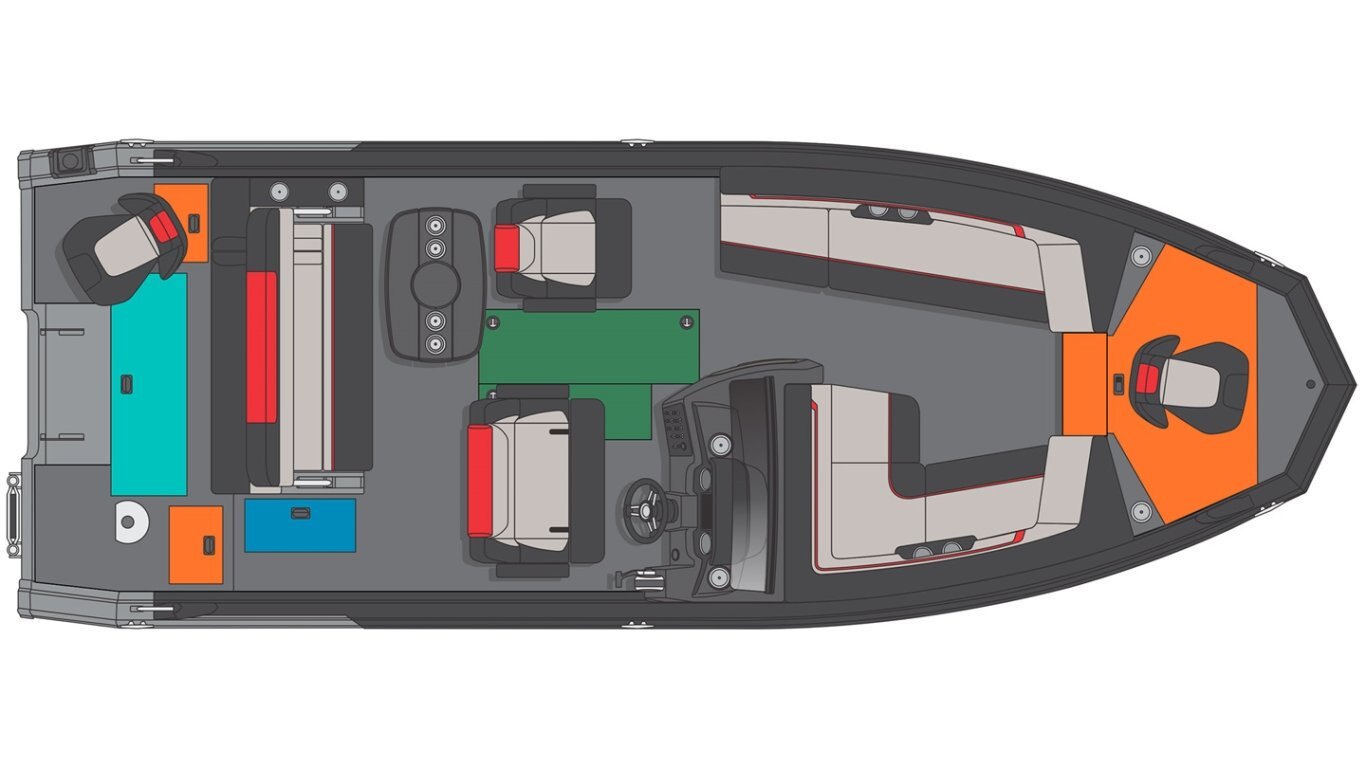 • Wide fiberglass helm with glove box, gauges, radio, wireless cell phone charger, and cup-holders