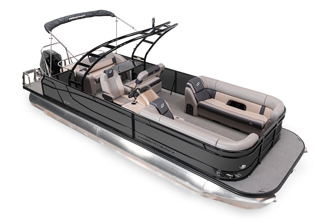- Protective cover (black) for pontoon with an electric bimini and performance configuration