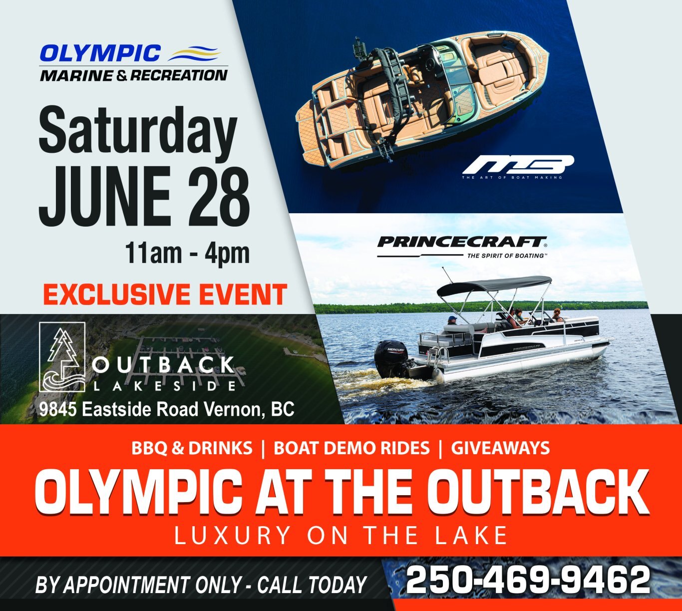Join us for an exclusive event at Outback Lakeside on June 28, from 11 am to 4 pm. We will be showcasing premium boats and the latest in boating technology. Connect with industry professionals, enjoy delicious food and drinks, and explore the beauty of the Okanagan. Don’t miss this opportunity to elevate your boating experience. This exclusive event is by appointment only, so please call today to reserve your spot and ensure your entry!