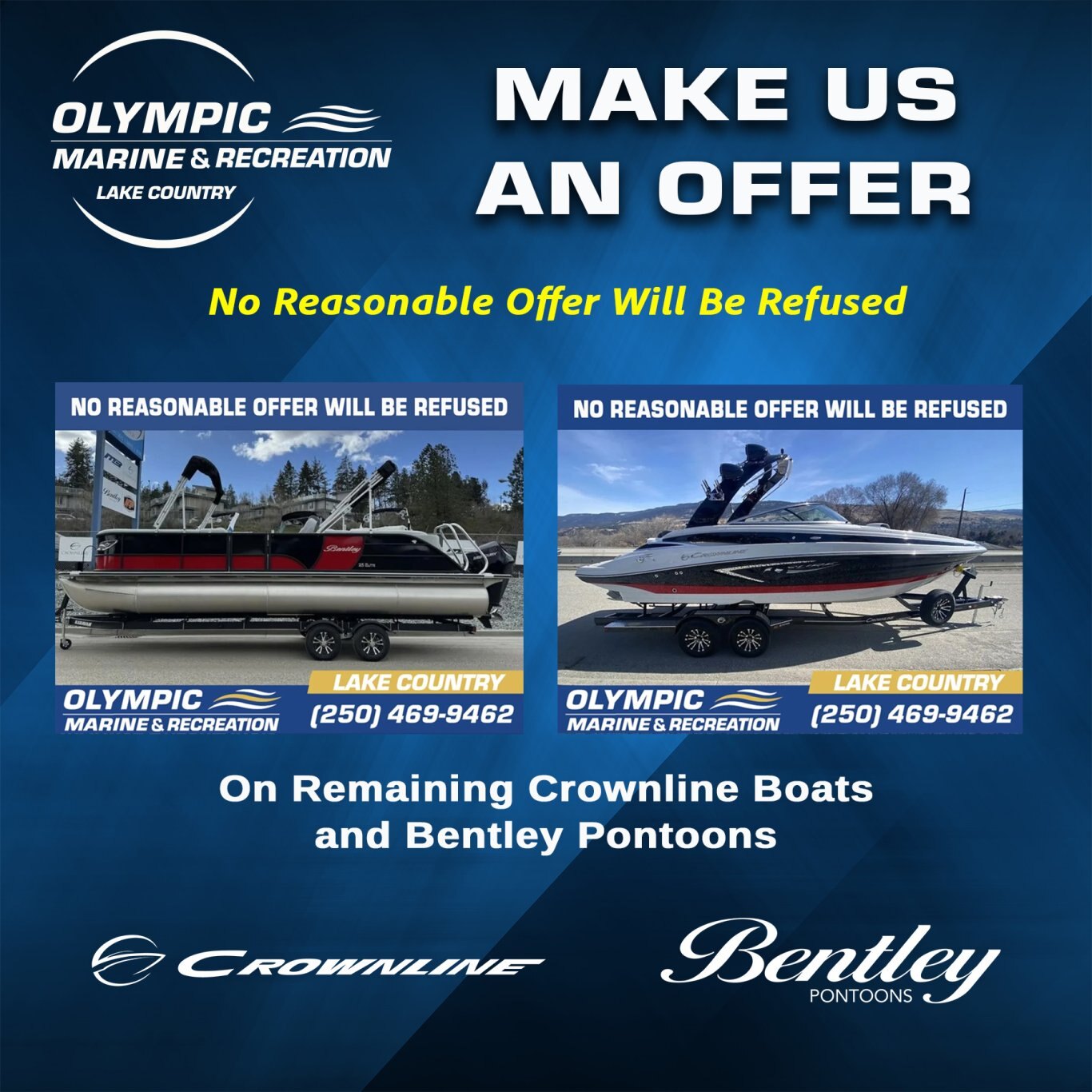 Right now at Olympic Marine & Recreation in Lake Country, BC, we’re running a special “Make Us An Offer” promotion on our remaining Crownline boats and Bentley pontoons!