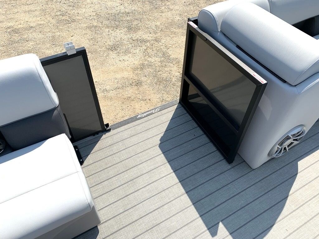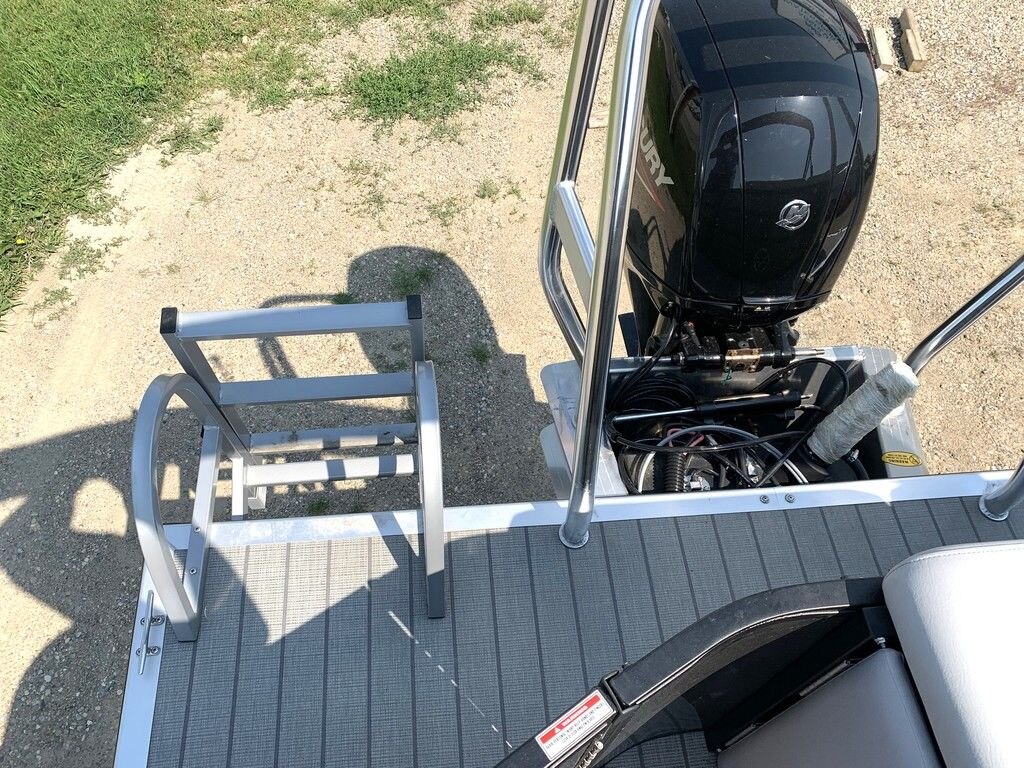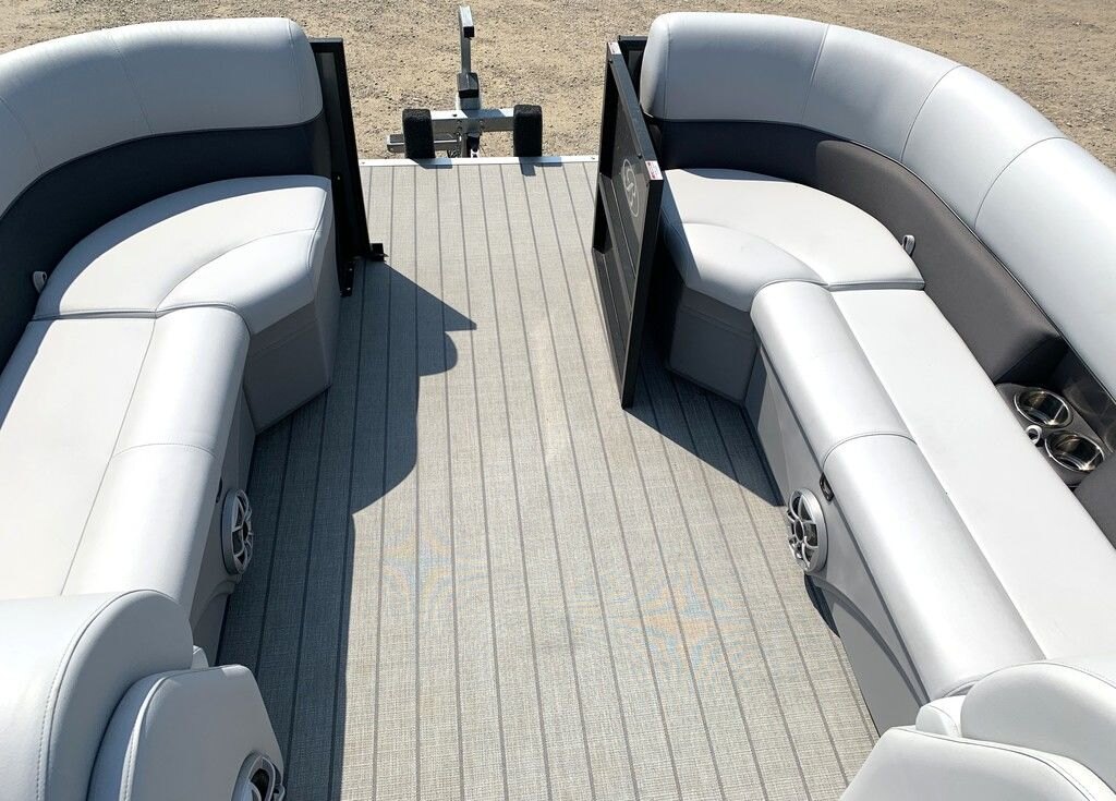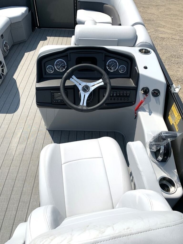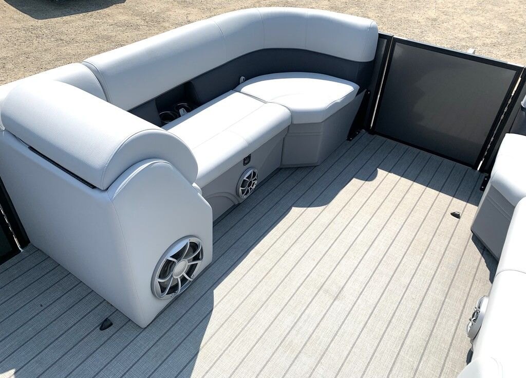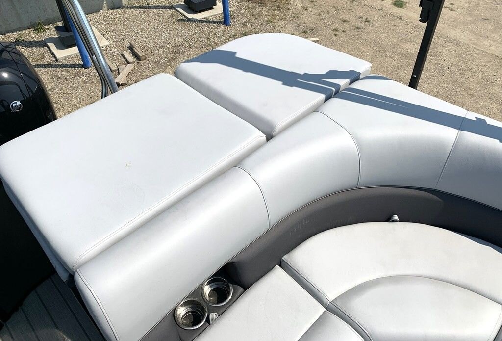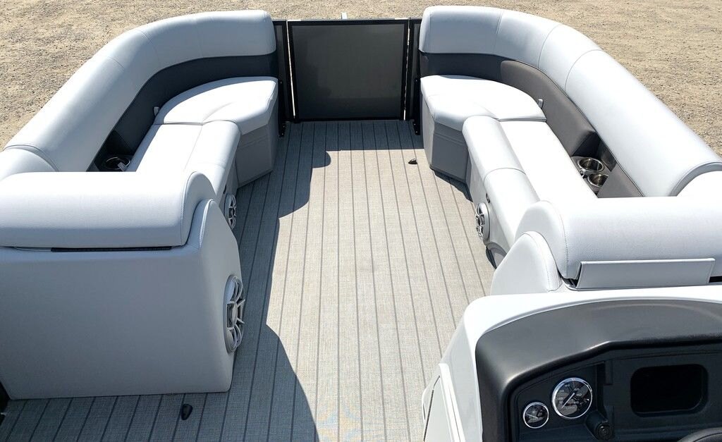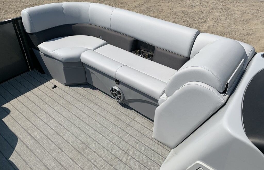 Cruise your way to a good time on this pontoon! There are three different seating spaces to relax on while the captain navigates, plus one of them even has a 32" cooler seat and there are plenty of cupholders to set your drink. Upgraded 150 HP Mercury motor. The bumper guard with rubber insert will protect your unit in case you bump into the dock. Crank up your favorite tunes with the JBL R3500 stereo system and the four speakers. Plus, the switch panel comes with easy access resettable breakers.