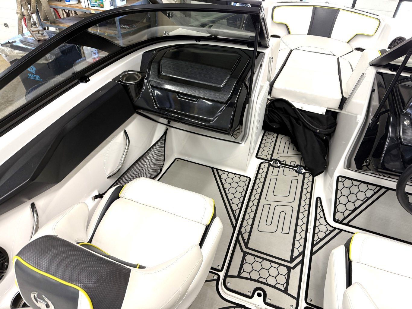 With full ballast and a full crew, the rider gets a long wave and a no-fear ride thanks to a completely internal propulsion system. The wakeboard platform is positioned low and close to the water. The transom seat backs can tilt forward to create aft-facing seating ideal for lounging at anchor or on the sandbar. With seat backs in their running position, you get arena seating that wraps from the helm seat around to the portside passenger console, which contains a remote for the premium Kicker stereo, plus USB inputs, a 12-volt receptacle and an auxiliary input. Enjoy your music your way and charge whatever you want for all-day connectivity.