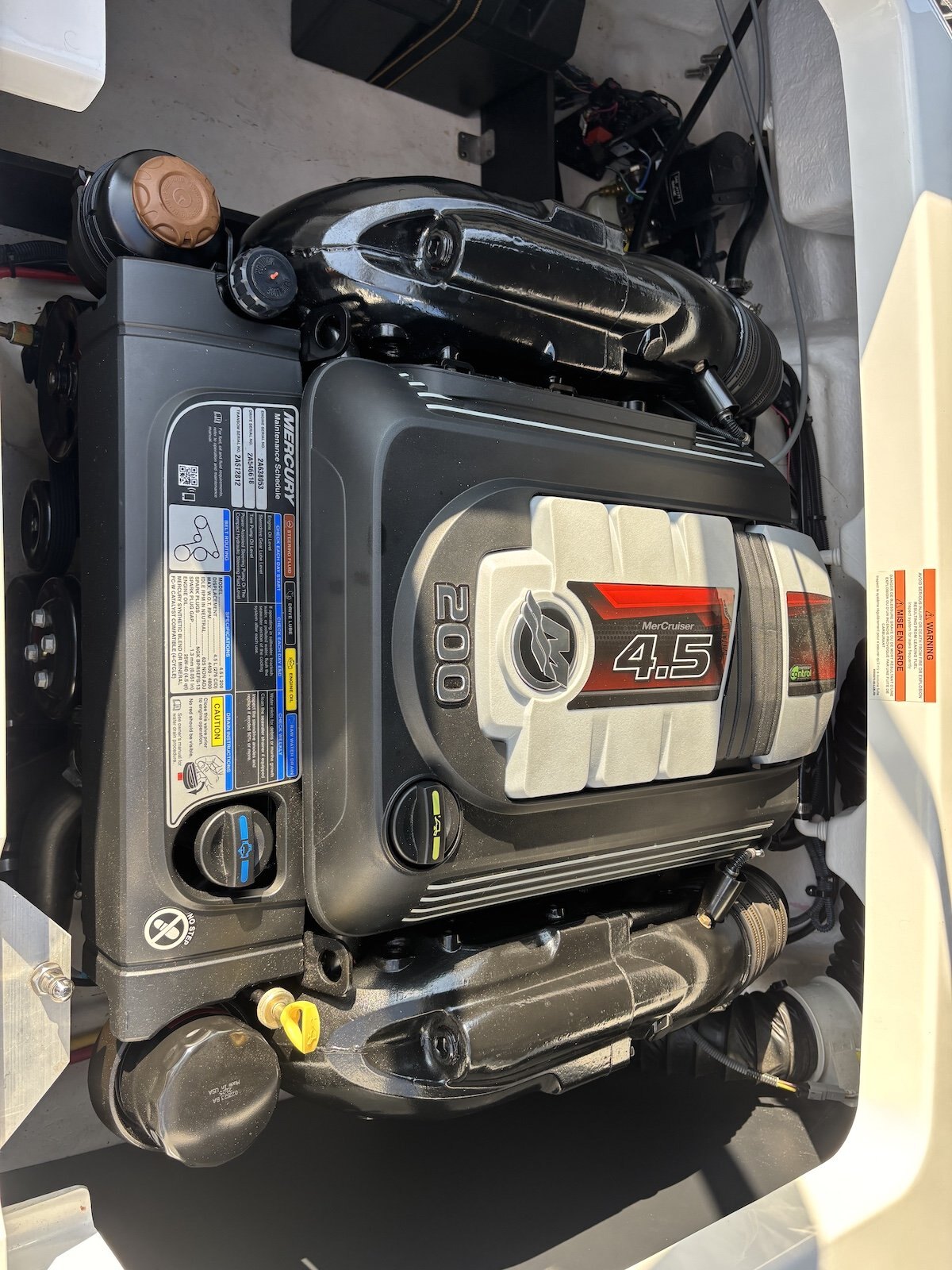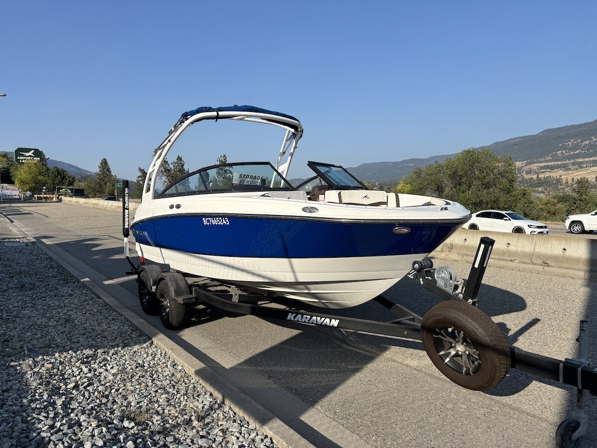 The 2019 Monterey M20 has anoverall length of 20 feet, an 8'4" beam, and a max draft of 3 feet. It features a fiberglass hull, a dry weight of 3,400 lbs, and is powered by a 2019 Mercruiser 200HP 4.5L gas engine. Standard features include a swim platform, sun deck, and stainless steel ski tow.